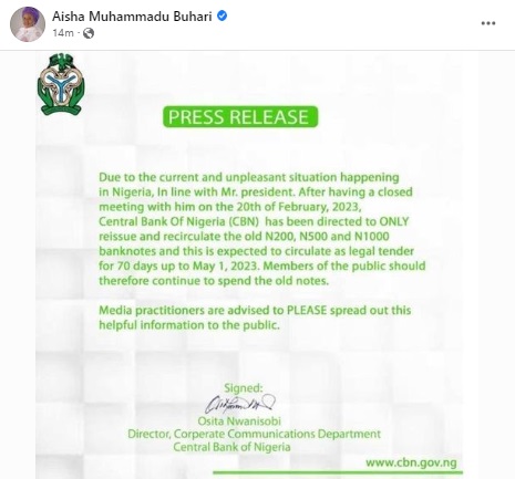 A fake circular shared by some Nigerians including the first lady of Nigeria, Mrs Aisha Buhari, claimed the President gave the order on February 20.