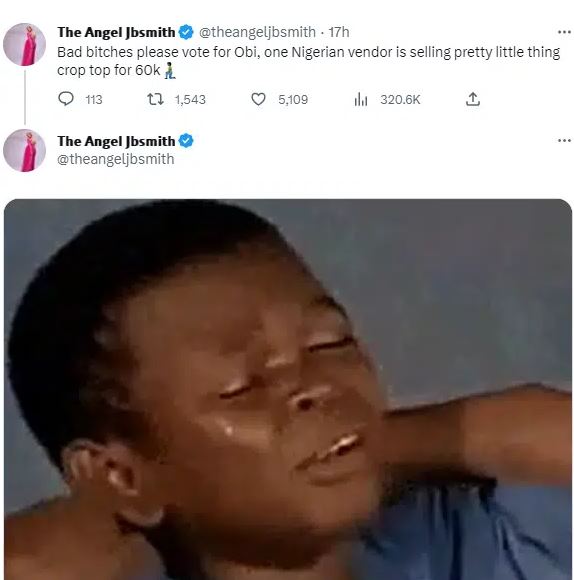 “Bad b*tches please vote for Obi, one Nigerian vendor is selling pretty little thing crop top for 60k”.