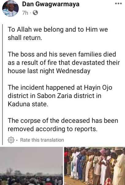 Eight family members perished in a fire that razed their house in Zaria, Kaduna State.