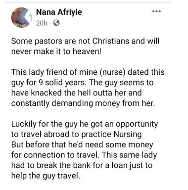 “Some pastors are not Christians and will never make it to heaven! This lady friend of mine (nurse) dated this guy for 9 solid years. The guy seems to have knacked the hell outta her and constantly demanding money from her,” he narrated.