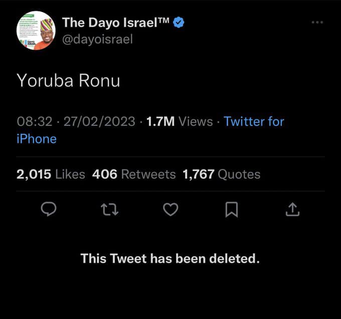 All Progressives Congress National Youth President, Dayo Israel has been forced to delete a tweet capable of inciting a tribal agenda in the 2023 election.