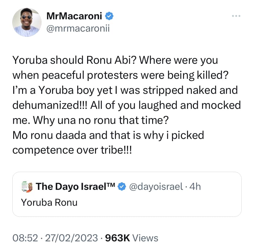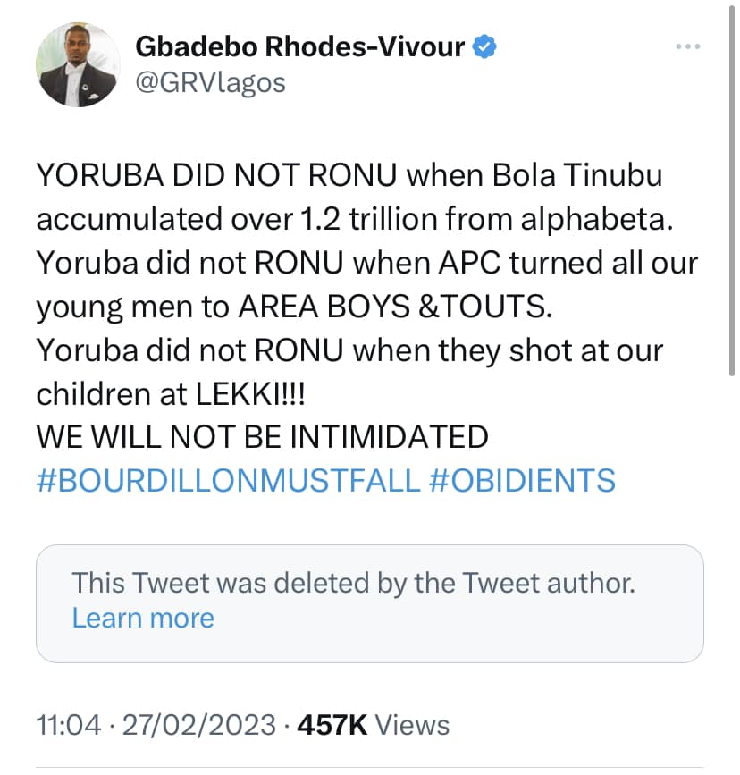 Some of the persons that called out Dayo over his “Yoruba Ronu” (Yoruba think) tweet, include Lagos Labour Party governorship candidate, Gbadebo Vivour-Rhodes.