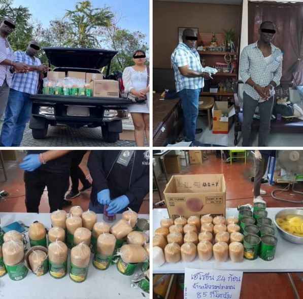 Two Nigerian nationals alongside a Thai woman have been apprehended in Bangkok following the seizure of 8.5 kilogrammes of heroin found stuffed into fruit cans destined for Hong Kong.