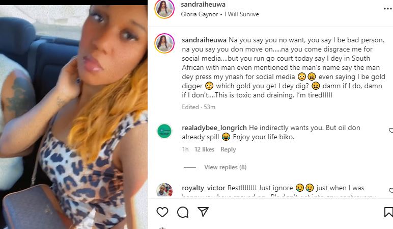 ‘’Na you say you no want, you say I be bad person, na you say you don move on…..na you come disgrace me for social media….but you run go court today say I dey in South African with man even mentioned the man’s name say the man dey press my ynash for social media even saying I be gold digger which gold you get I dey dig? damn if I do, damn if I don’t….This is toxic and draining. I’m tired!!!!!''