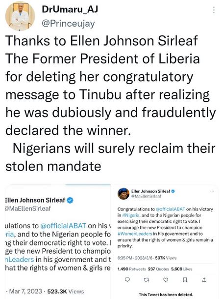 Ex-Liberian President, Ellen Johnson Sirleaf has deleted a tweet, where she congratulated Nigeria’s president-elect, Asiwaju Bola Tinubu.