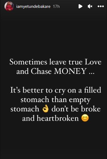 Taking to her Instagram page, Yetunde opined that it is better for one to be rich when they get heartbroken because that way they can cry on a filled stomach.