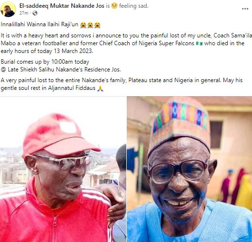 Mamuwa wrote: “Inna lillahi wa Inna ilaihir raji’un , i just lost my elder brother these morning, Coach Mabo Ismaila, former Chief Coach of Super Falcons of Nigeria, may Aljanna Firdausi b his final abode, Ameen thumma Ameen.”