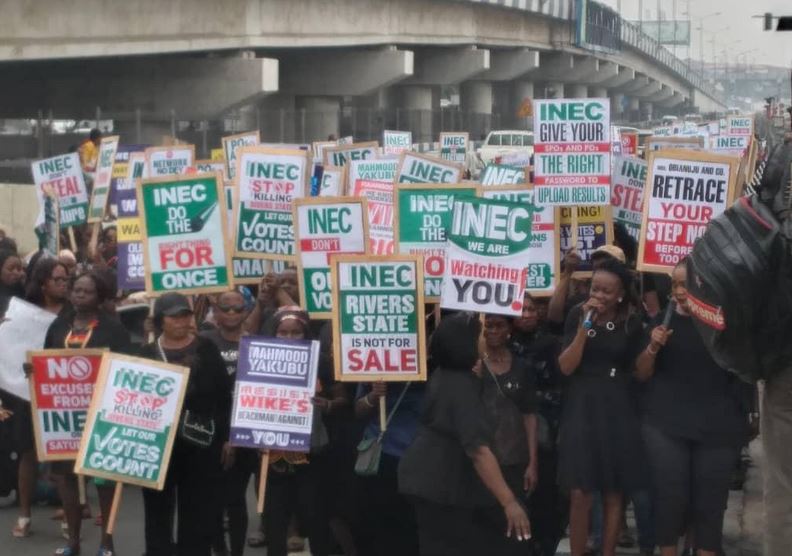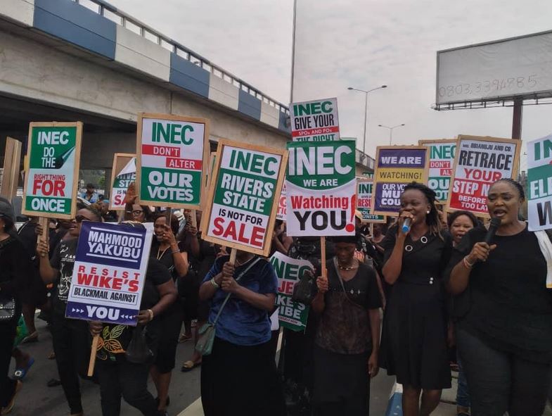 The women carried different placards with different inscriptions such as ''Mahmood Yakubu, resist Wike's blackmail against you'', "INEC Rivers State is not for sale," "INEC, don't alter our votes," and "INEC do the right thing for once," amongst others.