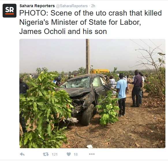 A source told SaharaReporters that the driver slammed on the brakes after receiving a radio message from the security car behind the minister’s main vehicle alerting him to a low pressure on one of the back tires. The driver’s panicked reaction precipitated an accident as the security vehicle then rammed into the minister’s vehicle, which somersaulted several times, instantly killing Mr. Ocholi and his first son. Mrs. Ocholi was subsequently pronounced dead after she was taken to a hospital.