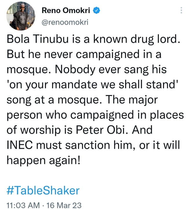 "Bola Tinubu is a known drug lord. But he never campaigned in a mosque. Nobody ever sang his 'on your mandate we shall stand' song at a mosque. The major person who campaigned in places of worship is Peter Obi. And INEC must sanction him, or it will happen again!"