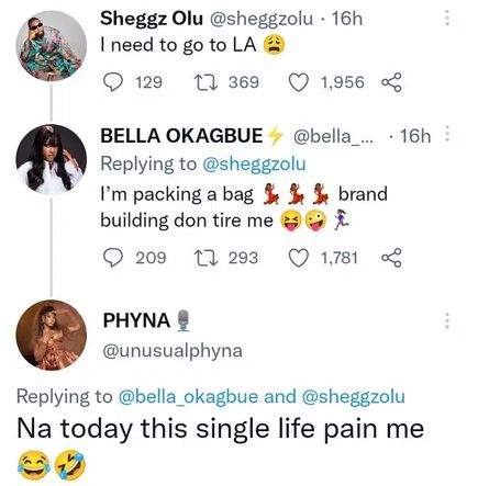 Her colleague, Sheggz took to his Twitter page to reveal that he’s jetting off to LA; his girlfriend, Bella reacted in excitement, revealing that she’s packing her bags to leave with him.