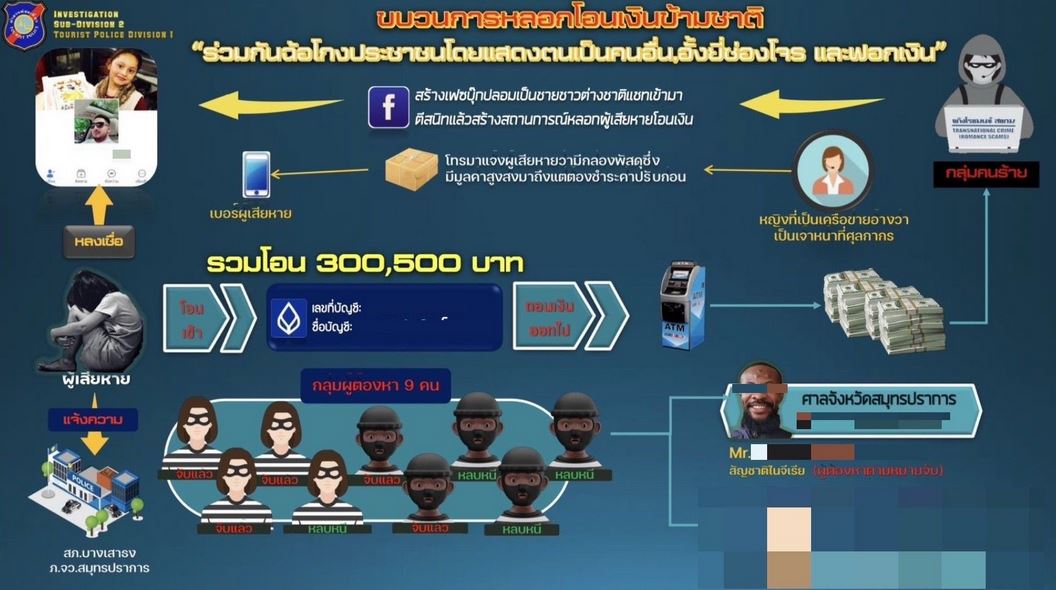The suspect was the subject of an arrest warrant issued by Samut Prakan Provincial Court for 4 counts of violating the law; defrauding the public by impersonating another person, entering false information into the computer system, criminal enrichment and money laundering.