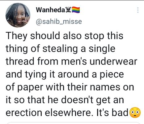 “They should also stop this thing of stealing a single thread from men's underwear and tying it around a piece of paper with their names on it so that he doesn't get an er*ction elsewhere. It's bad,” she tweeted.