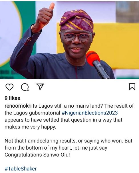 Former Presidential aide, Reno Omokri has congratulated Babajide Sanwo-Olu, even though the winner of the Lagos State governorship election has not yet been declared by INEC.
