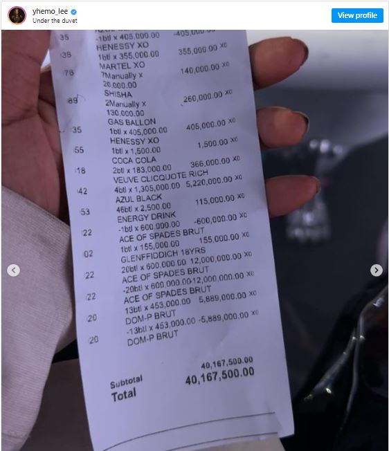 In a post on his Instagram page, the singer shared several pictures of his expensive attire and accessories, including several empty bottles that he enjoyed with his friends. He then also showed the slip containing the amount he spent.
