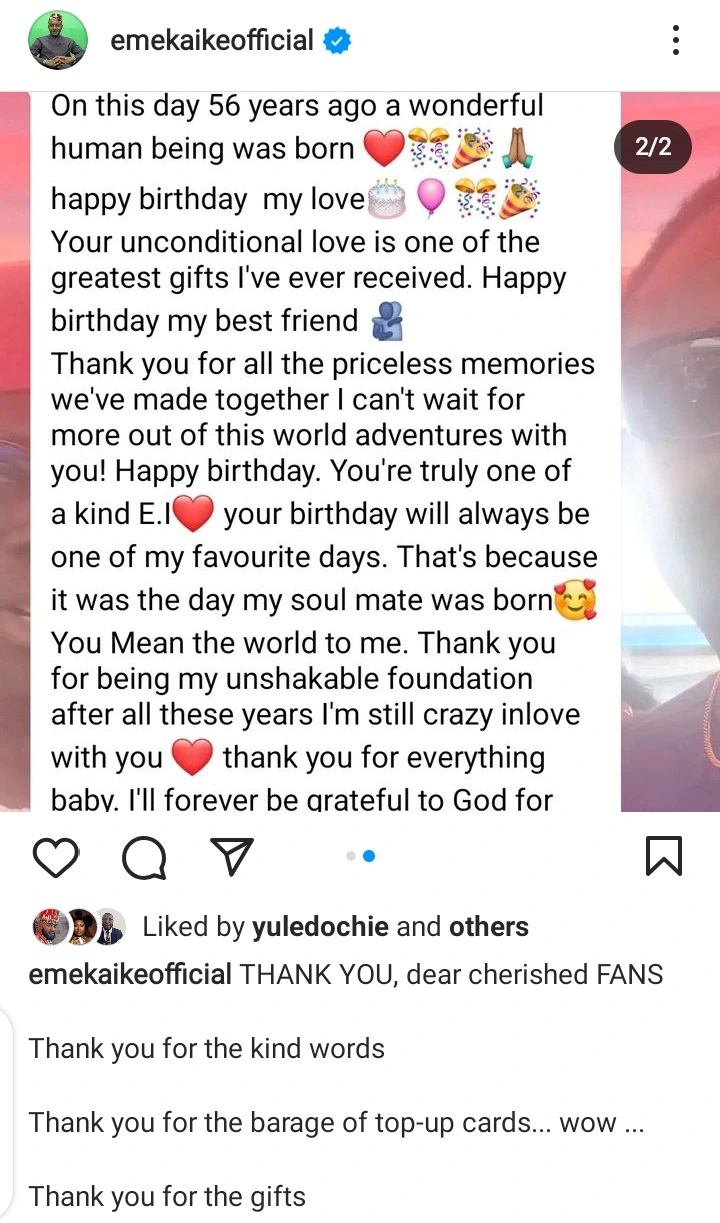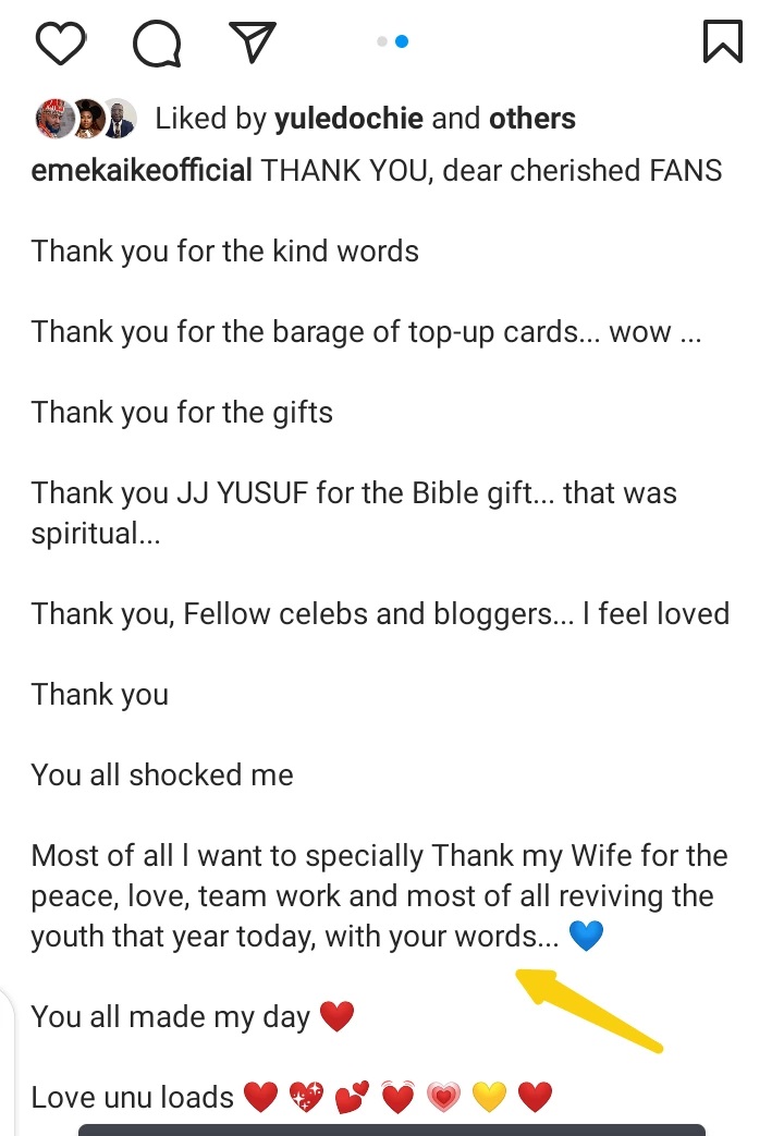 In Emeka Ike's post, he noted that he cherished his fans, thanking his wife for the peace, love, and teamwork and for reviving the youth in him.