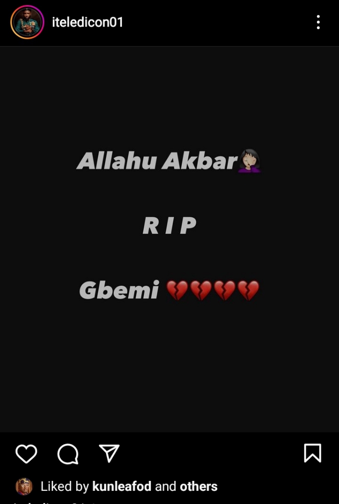 The news of her tragic demise was shared by colleagues Itele and Zainab Balogun, who mourned her on their Instagram pages.