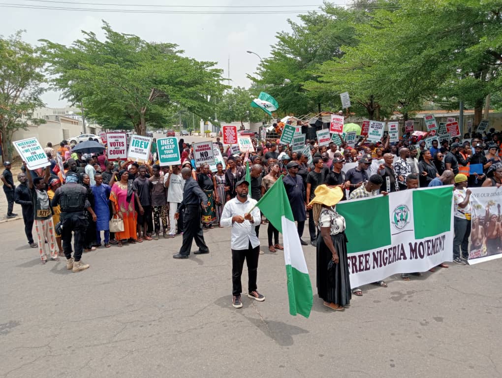 The women, who are members of the Free Nigeria Movement, were at the US Embassy to report the alleged fraud that happened during the 2023 polls.