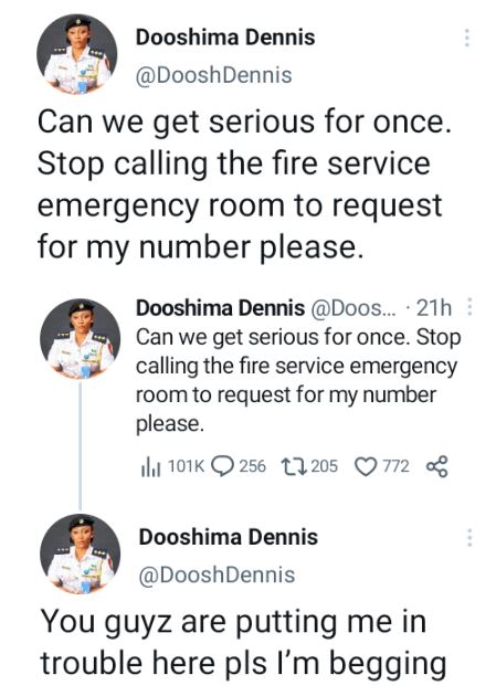 “Stop calling the fire service emergency room to request for my number please. You guys are putting me in trouble here pls I’m begging." she tweeted.