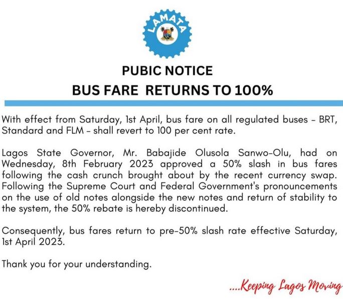The government of Lagos state has announced that the 50% slash on transport fares on all regulated buses has ended.