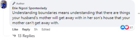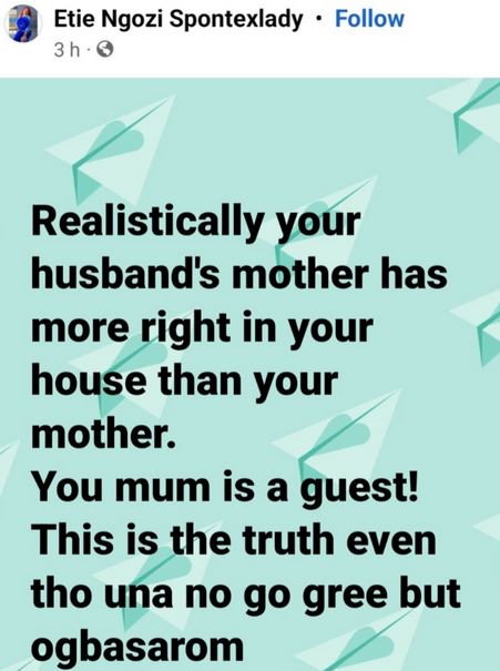Etie Ngozi wrote: “Realistically your husband's mother has more right in your house than your mother. Your mum is a guest! This is the truth even tho una no go gree but ogbasarom.”