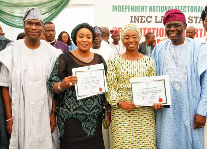 Lagos State Governor Babajide Sanwo-Olu, and his deputy, Obafemi Hamzat, received their Certificate of Return issued by the Independent National Electoral Commission, INEC, on Thursday, March 30.