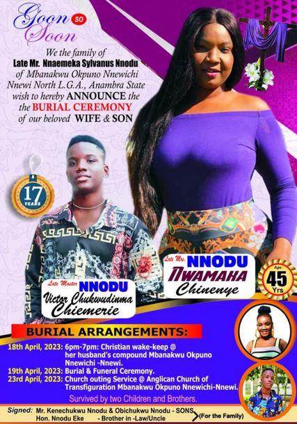 Their remains will be laid to rest in Mbanakwu Okpuno, Nnewichi in Nnewi North Local Government Area of Anambra State on April 19th, 2023.
