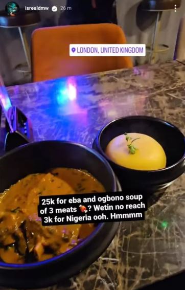 At 25,000 naira for the Nigerian delicacy of eba and ogbono soup, Isreal took to his Instagram story to lament the difference in prices between Nigeria and in the UK.