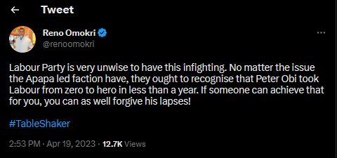 He wrote, “Labour Party is very unwise to have this infighting. No matter the issue the Apapa-led faction has, they ought to recognize that Peter Obi took Labour from zero to hero in less than a year. If someone can achieve that for you, you can as well forgive his lapses!”