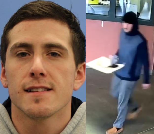He was seen on surveillance video leaving in a blue and white hoodie with the hood plugged low over his eyes, gray sweatpants, and slippers.