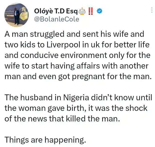 “A man struggled and sent his wife and two kids to Liverpool in uk for better life and conducive environment only for the wife to start having affairs with another man and even got pregnant for the man.