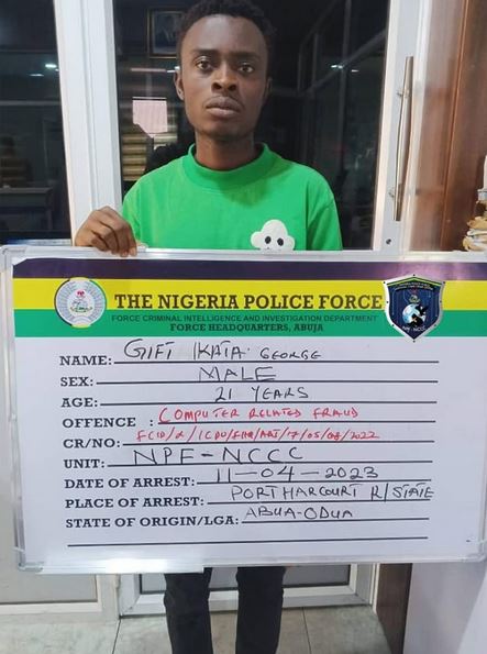 "Upon the receipt of this intelligence, Seasoned Cybercrime Forensic and Intelligence Assets under the supervision of DCP Uche Ifeanyi Henry, the Director NCCC, were deployed on the Case. The painstaking effort of the team led to the arrest of one George Gift Ikata, a 21-year-old male indigene of Abua Local Government Area in Rivers state. The suspect who resides in Iwofe Rivers state voluntarily elected in a written statement to have created the said platform for fraudulent purposes.