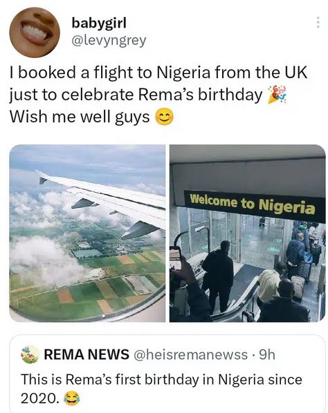 “Booked a flight to Nigeria from the UK just to celebrate Rema’s birthday 🎉 Wish me well guys 😊”