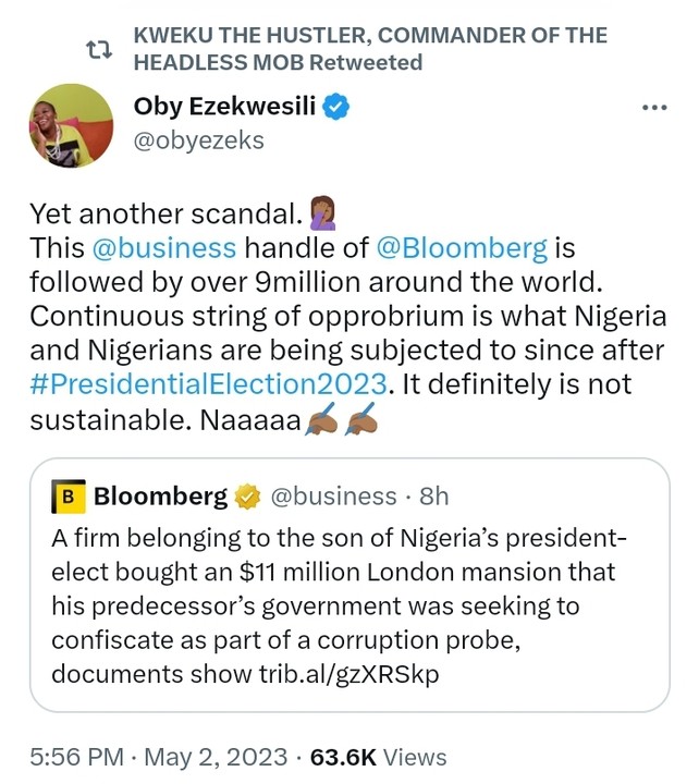 A former Nigerian Minister of Education, Oby Ezekwesili has reacted to Bloomberg's story revealing that Bola Tinubu's family bought an $11million mansion that the anti-corruption agency, EFCC was seeking to confiscate as part of corruption probe.