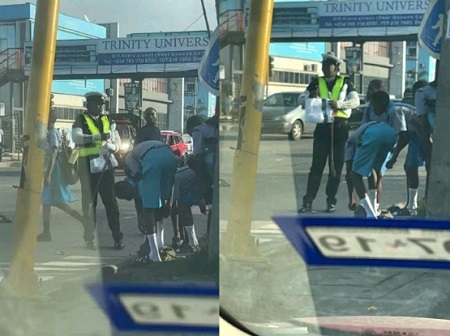 The officer who controls traffic at Sabo bus stop in Lagos state went viral two months ago for always stopping pupils who are not well dressed and ensuring they dress well.