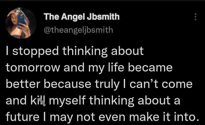 “I stopped thinking about tomorrow and my life became better because truly I can’t come and k¡ll myself thinking about a future I may not even make it into”.