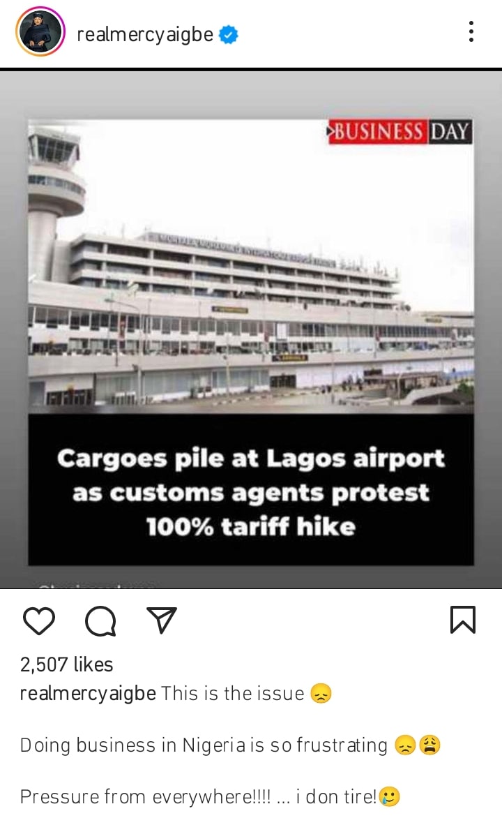She wrote: “This is the issue. Doing business in Nigeria is so frustrating. Pressure from everywhere!!!! I don tire”.