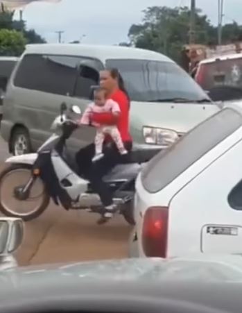 A mother has been seen carrying her baby on the lap while riding a motorcycle.