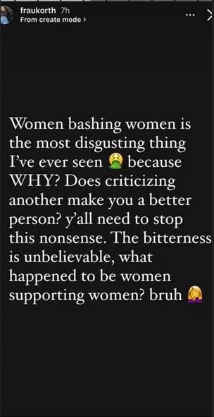 In an Instastory she shared afterward, Korth stated that women bashing other women is the most disgusting thing she has ever seen.