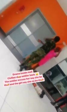 A video has captured the moment a lady slapped a military officer who first assaulted her in a mall while accusing her of being a thief.