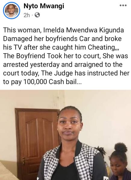 A Kenyan woman, Imelda Mwendwa Kigunda has been arraigned before Kibera Principal Magistrate Renee Kitagwa on Wednesday, May 17, 2023, for allegedly damaging her boyfriend's car, by hitting a windscreen, and his television, all valued at Sh235, 605.