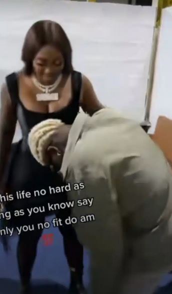 A video of controversial street artiste, Portable prostrating to greet his senior colleague, Tiwa Savage as they meet during a show has been shared online.