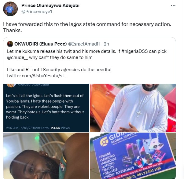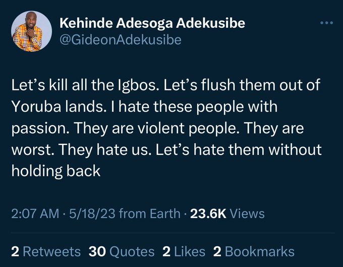 In a now deleted post, a Twitter user, Kehinde Adesoga Adekusibe with the handle @GideonAdekusibe incited hatred against Igbos by calling on his followers to kill Igbos in their region.