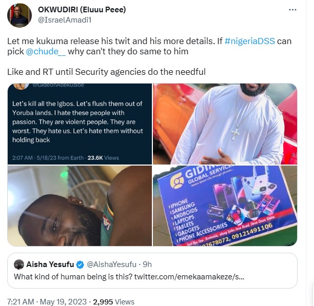 "Let me kukuma release his twit and his more details. If #nigeriaDSS can pick @chude__ why can't they do same to him