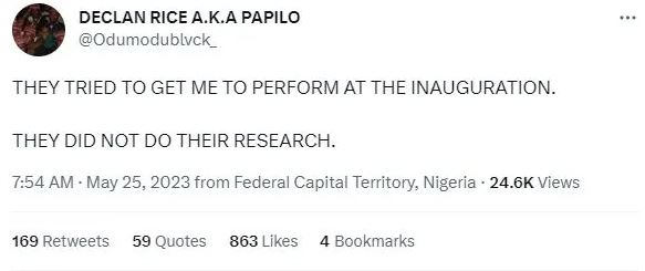 Popular Nigerian rapper, Odumodublvck has taken to Twitter to disclose that he turned down a request to perform at the inauguration of the President-elect, Asiwaju Bola Tinubu.