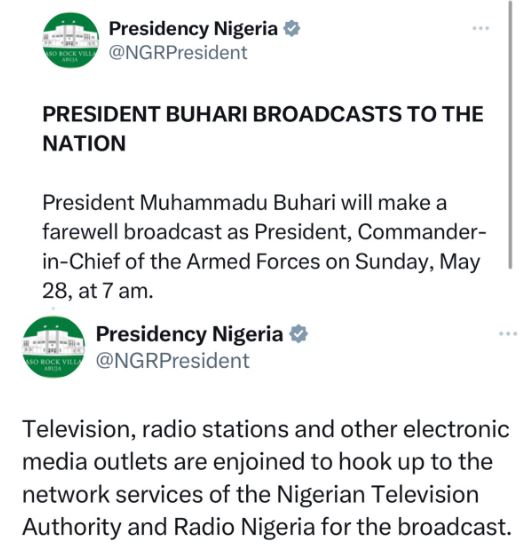 Buhari will make a farewell broadcast as President, Commander-in-Chief of the Armed Forces on Sunday, May 28, at 7am.