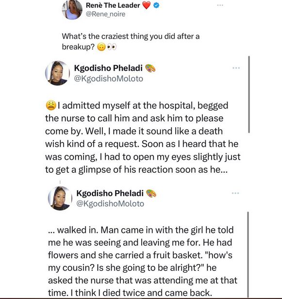 The lady @kGodishoMoloto was responding to a Twitter user who asked people to share some of the craziest things they did after a breakup.