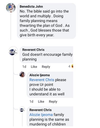 Some Facebook users have said that family planning is a sin and not encouraged by God.