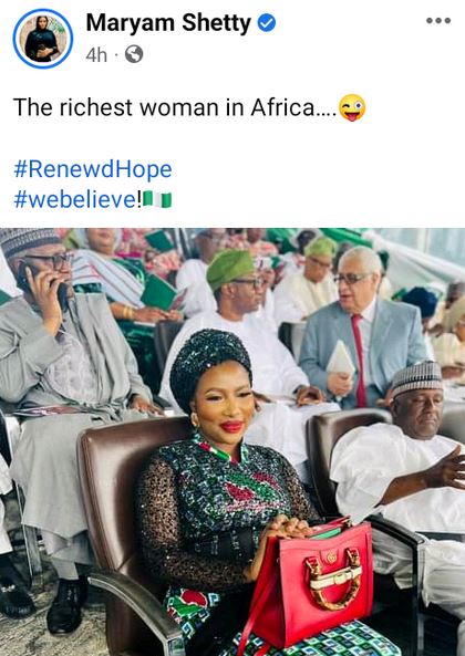 She stated this after she sat in the VIP section with Nigerian billionaires, Aliko Dangote, Femi Otedola and founder of BUA Group, Abdul Samad Rabiu, during the inauguration of President Bola Tinubu held in Abuja on Monday.
