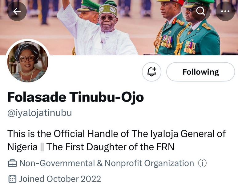 Folasade Tinubu-Ojo, the first child of President Bola Tinubu and the Iyaloja-general of Lagos, has updated her Twitter bio to ‘first daughter of the Federal Republic of Nigeria (FRN)’.